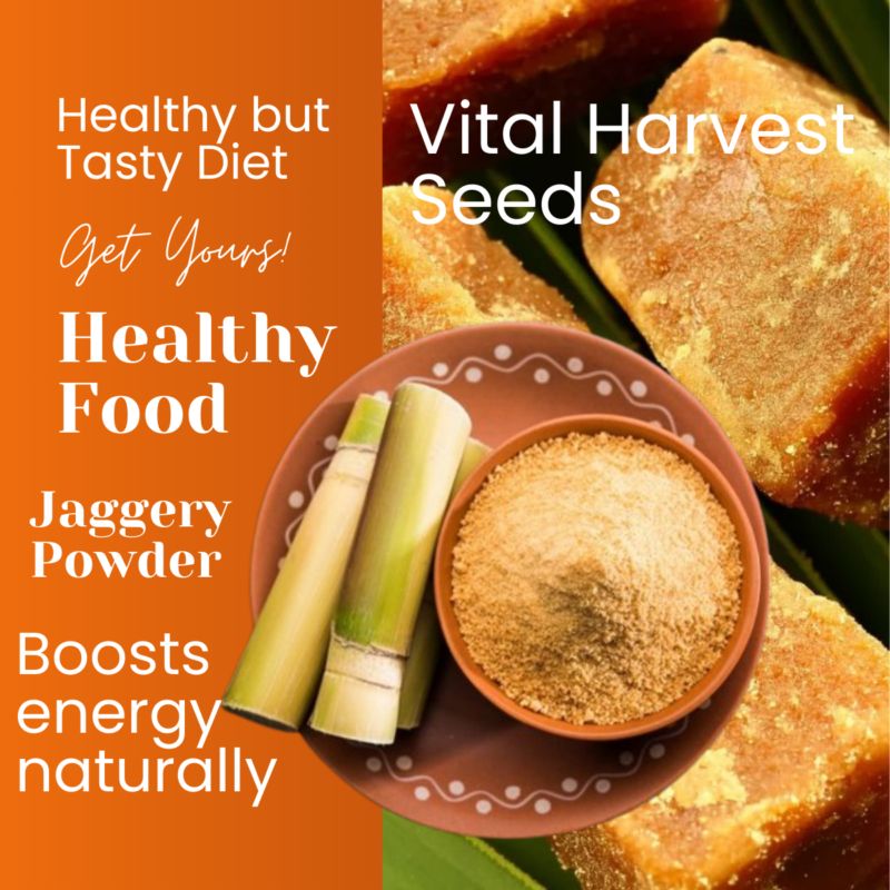 Vital Harvest Seeds’ Jaggery Powder is a wholesome alternative to refined sugar, packed with natural minerals and nutrients. Made from the finest sugarcane, it is free from chemicals and artificial additives, ensuring purity in every spoonful.