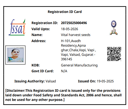 At Vital Harvest Seeds, every product we offer is crafted and packaged in full compliance with FSSAI (Food Safety and Standards Authority of India) guidelines. We are committed to maintaining the highest standards of quality, purity, and hygiene across all stages – from sourcing to packaging. Our products are free from harsh chemicals, preservatives, and artificial additives, ensuring that you receive only naturally wholesome and safe food ingredients.